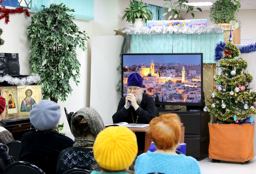 Протоиерей Николай Скурат рассказал собравшимся о храме Рождества Христова в Вифлееме, о пещере Рождества Господа нашего Иисуса Христа, о рождественском храме в Новом Иерусалиме. Слушателям были показаны фотографии храмов в Вифлееме и в Новом Иерусалиме. Отец Николай ответил на вопросы подопечных центра социального обслуживания и показал им небольшой религиозно-философский видеофильм.