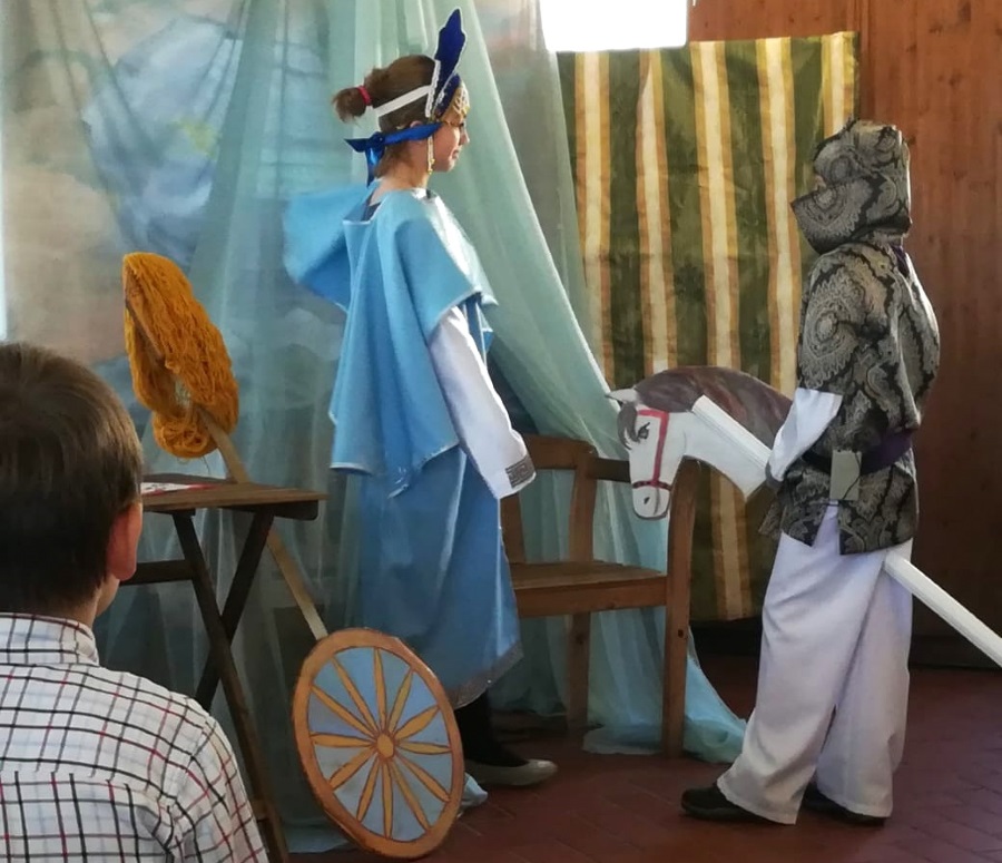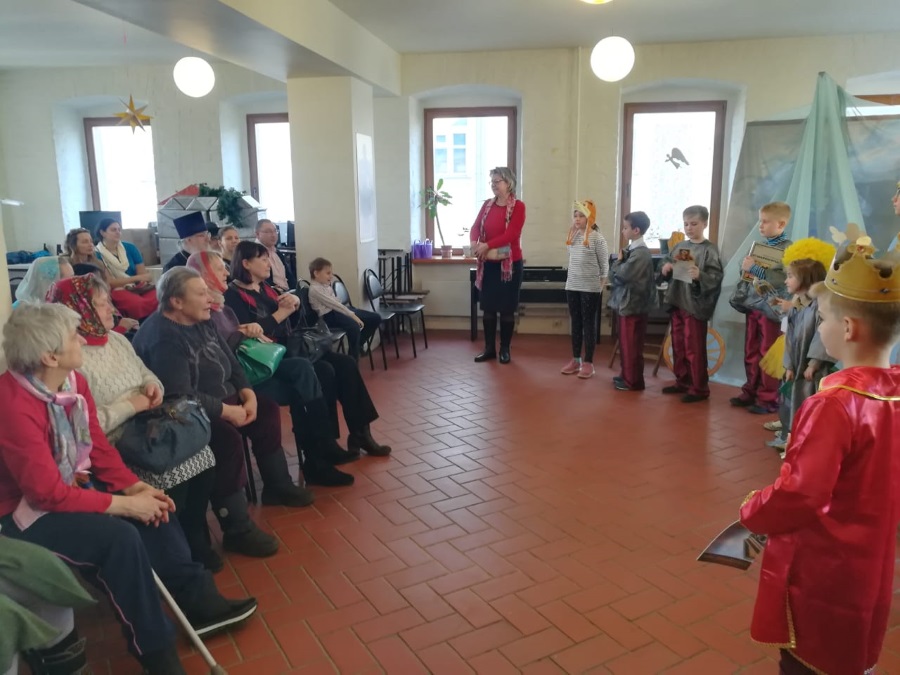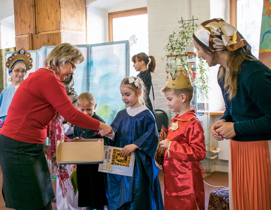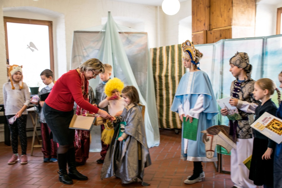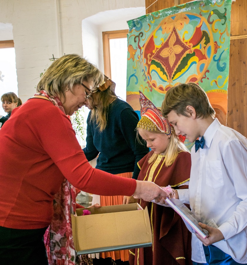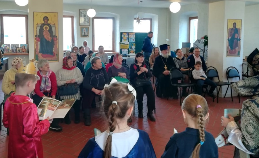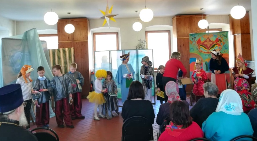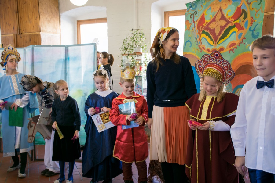 После трапезы прихожане-миссионеры проводили женщин в актовый зал воскресной школы, где их ожидал… спектакль по «Сказке о мертвой царевне и семи богатырях» А. С. Пушкина. Надо сказать, что гостьям были заранее известно о предстоящем представлении, подготовленном учащимися младших групп детской воскресной школы. И поэтому, собираясь накануне в храм, они тоже проявили себя как творческие личности и вместе с сорудниками ЦСА своими руками сделали юным актерам подарки — из атласных лент изготовили заколки и брошки в технике канзаши.