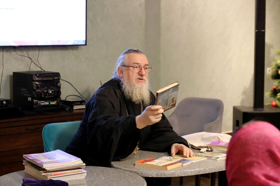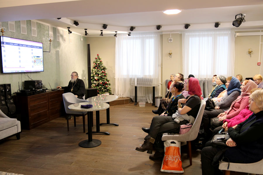 Преподаватель взрослых групп воскресной школы протоиерей Николай Скурат поздравил собравшихся в центре с Рождеством Христовым и гражданским новолетием, рассказал им о церковном праздновании Рождества, Крещения Господня, о ближайших церковных событиях, а также о предстоящих Международных Рождественских чтениях. В конце беседы батюшка ответил на вопросы.