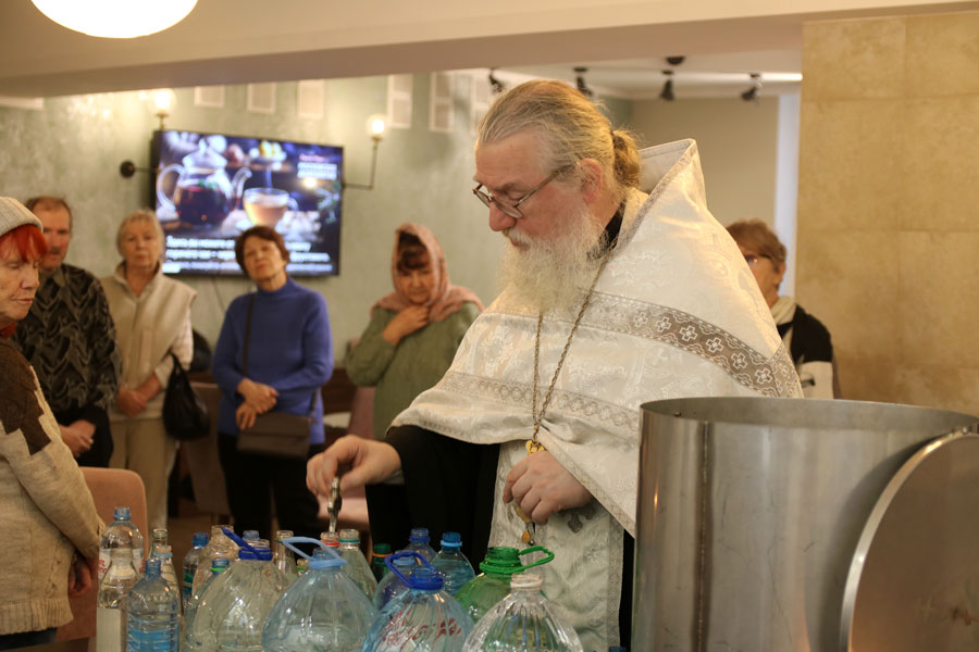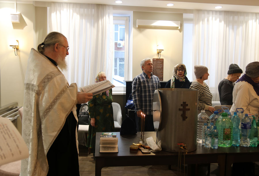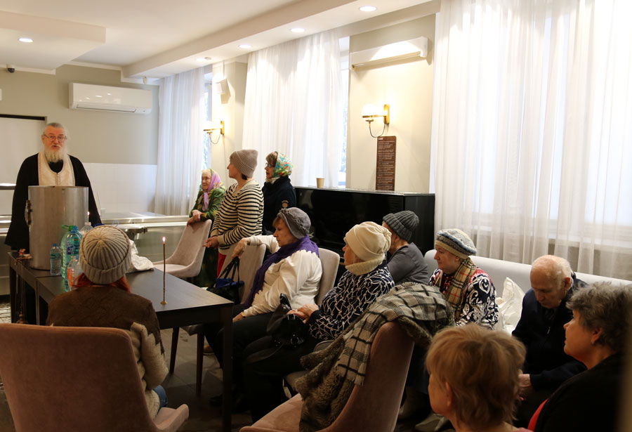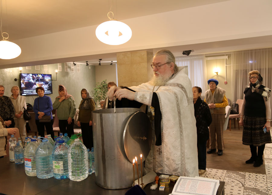 Перед началом общей молитвы протоиерей Николай, окормляющий этот центр, провел краткую беседу-напоминание о празднике Крещения Господня и о значении водоосвящения. Затем для немощных пожилых людей (самому старшему из которых исполнилось 96 лет) и инвалидов было совершено великое освящение воды. В богослужении приняли участие певчие из волонтерского приходского хора воскресной школы для взрослых.