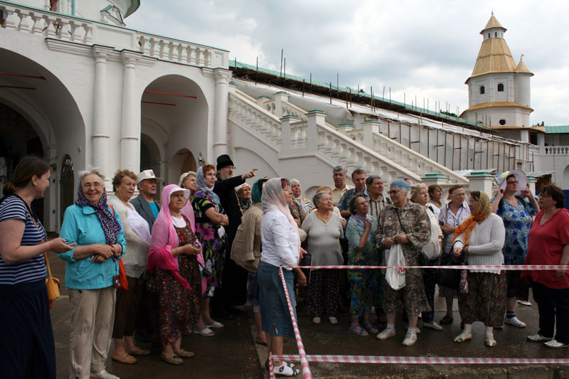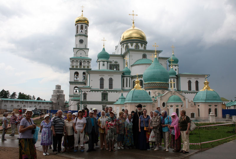 Далее путь лежал в Ново-Иерусалимский монастырь - примечательно, что эту обитель, посвященную Воскресению Христову, паломники посетили накануне отдания праздника Пасхи. Они побывали в возрождаемой церкви Всех святых под колокольней. В виду внезапного сильного дождя группе в виде исключения разрешили пройти через храм Воскресения в Успенский придел. Слушатели «Школы Православия» были восхищены размахом реставрационных работ в соборе, великолепием его интерьеров, так же как и фасадов. В Успенском приделе паломники поклонились деснице святой мученицы Татианы и другим святыням. Экскурсию внутри собора провела сотрудница паломнической службы обители. Паломники самостоятельно осмотрели скит Патриарха Никона на реке Иордан (Истре), Богоявленские купальни, Силоамский источник, ручей Кедрон и другие достопримечательности обители и ее окрестностей.