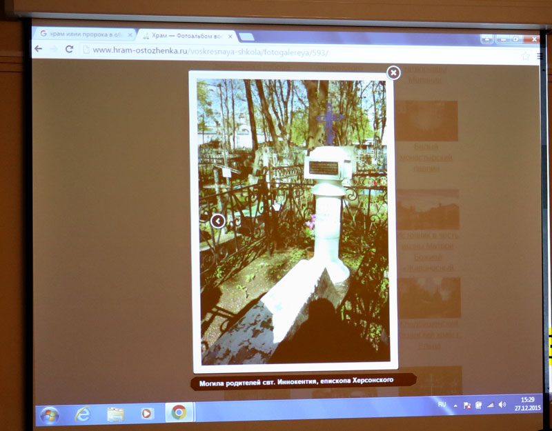 27 декабря 2015 года в библиотеке истории русской философии и культуры «Дом А. Ф. Лосева» на Арбате клирик Илие-Обыденского храма, преподаватель взрослых групп воскресной церковно-приходской школы, протоиерей Николай Скурат прочитал лекцию из цикла лекций по русской патрологии. Отец Николай рассказал о жизни и трудах святителя Иннокентия, архиепископа Херсонского и Таврического, и ответил на вопросы собравшихся.