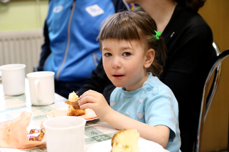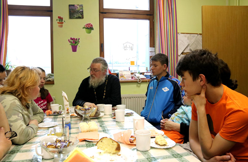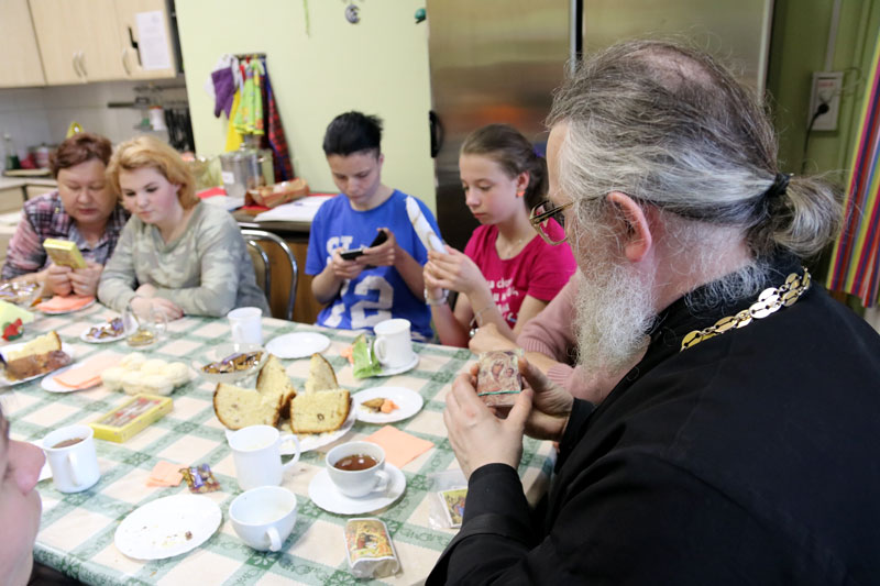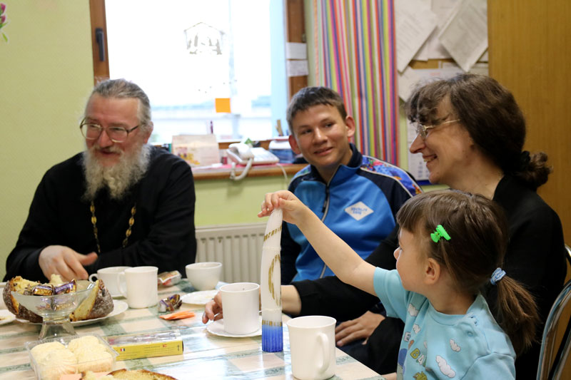 За чашкой чая с пасхальными куличами прошла беседа отца Николая с собравшимися детьми-сиротами. Батюшка рассказал ребятам о празднике Пасхи, ответил на их вопросы.