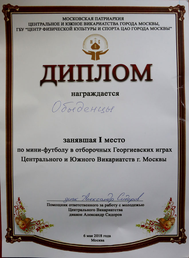 Турнир прошел на стадионе «Красная Пресня» в рамках первого этапа Георгиевских игр. Поздравляем «Обыденцев» и их капитана — выпускника детской воскресной школы Владислава Веселовского, занявших 1-е место на футбольных соревнованиях! У нас были достаточно сильные соперники, команда «Державники», но наши ребята играли технично и слаженно — и победили!