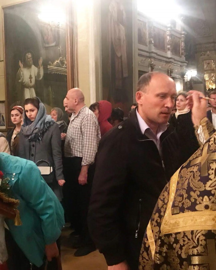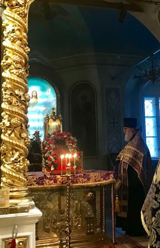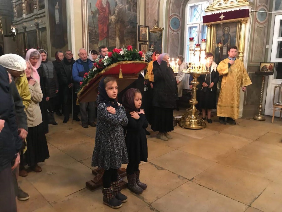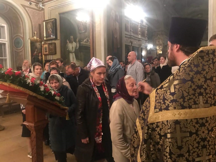 Накануне праздника вечером духовенство нашего храма соборно отслужило торжественное всенощное бдение. После великого славословия из алтаря был вынесен Крест, украшенный живыми цветами. Символ нашего спасения был возложен на аналой в центре храма, и верующие совершили ему поклонение.