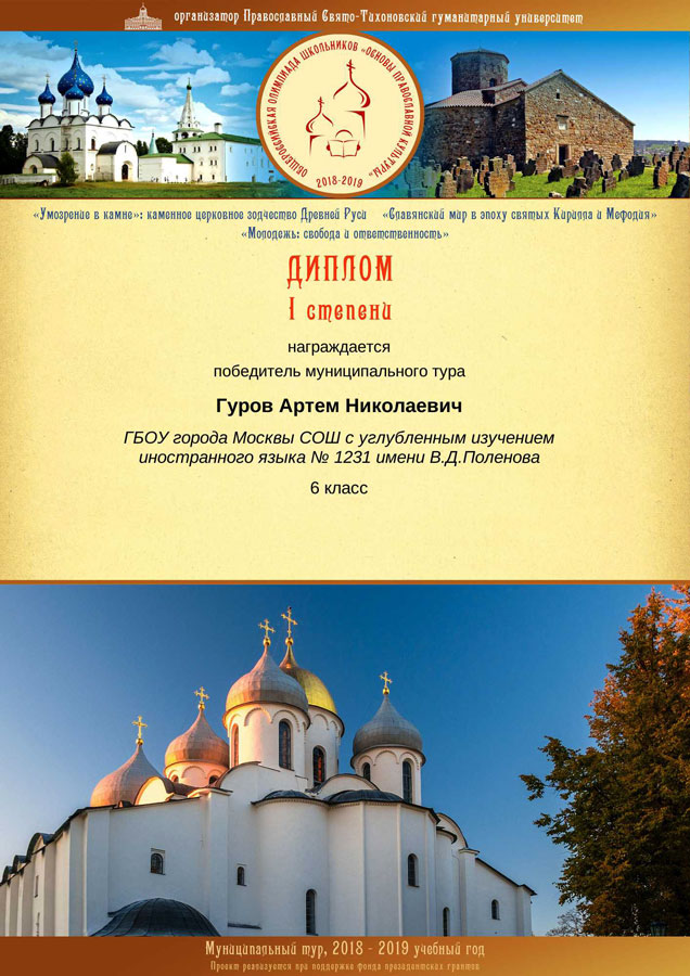Ученики нашей воскресной школы приняли участие в муниципальном туре олимпиады «Основы православной культуры» в административных округах столицы, к которым относятся их общеобразовательные заведения (в Центральном административном округе олимпиада была организована Центральным викариатством и Городским методическим центром Департамента образования г. Москвы). Победителями олимпиады стали наши юные прихожане — Лев Юдин (у него 1-ый результат по г. Москве среди учащихся 8-х классов), Илья Полосков (8-й результат по г. Москве среди учащихся 7-х классов), Артем Гуров (10-ый результат по г. Москве среди учащихся 6-х классов), призер муниципального тура олимпиады — Елизавета Кускова.