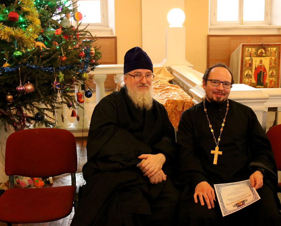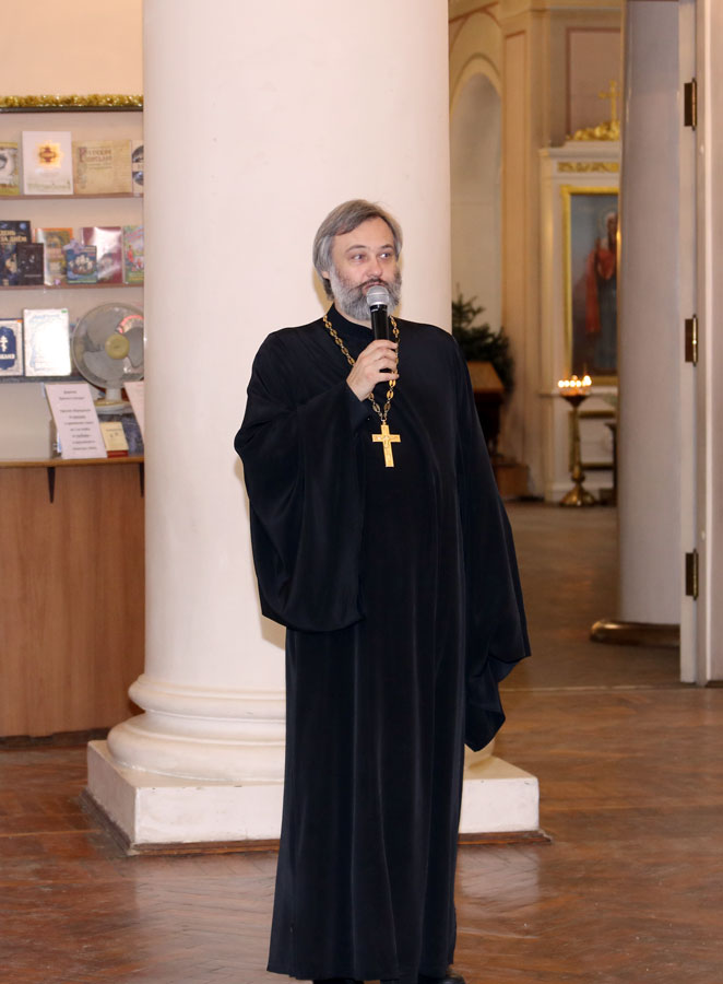 После общего пения тропаря праздника Рождества Христова с приветственным словом к собравшимся обратился ответственный по Центральному благочинию «Комиссии по церковному просвещению и деятельности воскресных школ» при Епархиальном Совете г. Москвы протоиерей Михаил Гуляев.