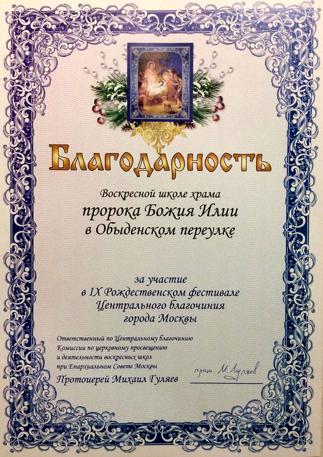 Ученики Илие-Обыденской воскресной школы исполнили на фестивале стихотворение Ф. М. Достоевского «Божий дар» (постановщик — преподаватель воскресной школы Т. Н. Семенова) и русскую народную песню «Как на тоненький ледок» (детский хор воскресной школы под управлением А. В. Акшаевой). Успехи выступавших были отмечены грамотой руководства воскресных школ Центрального благочиния.