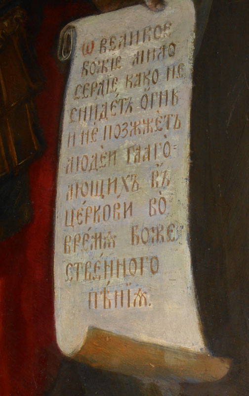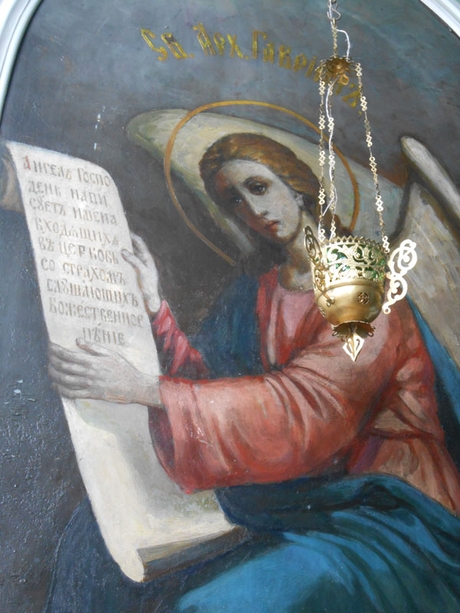 Идя на богослужение, наверное, каждый раз полезно ненадолго задержаться в притворе и перечитать то, что написано на свитках у изображенных по обеим сторонам Архангелов. У Архистратига Михаила в руках такие слова, после которых страшно должно быть произнести на службе праздное слово: «О великое Божие милосердие, како не снидет огнь и не позжжет людей, глаголющих в церкови во время Божественного пения…» И, может быть, мы начнем молиться так, что появится надежда попасть в число тех, кто записан Архангелом Гавриилом: «…входящих в церковь, со страхом слушающих Божественное пение».
