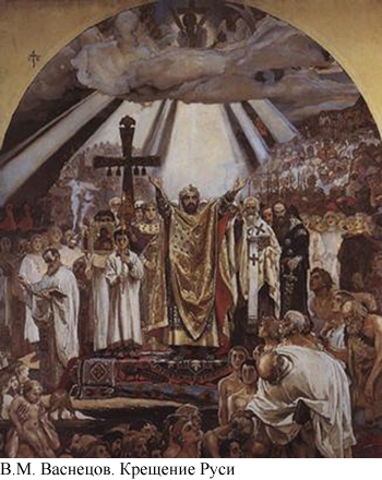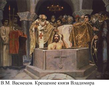 «И сошлось там людей без числа, — говорит летописец и далее продолжает. — Взрослые вошли в воду и стояли там одни по шею, другие — по грудь, некоторые держали младенцев, иереи же совершали молитвы, стоя на берегу. И была видна радость на небе и на земле по поводу стольких спасаемых душ». Это произошло в 988 году.