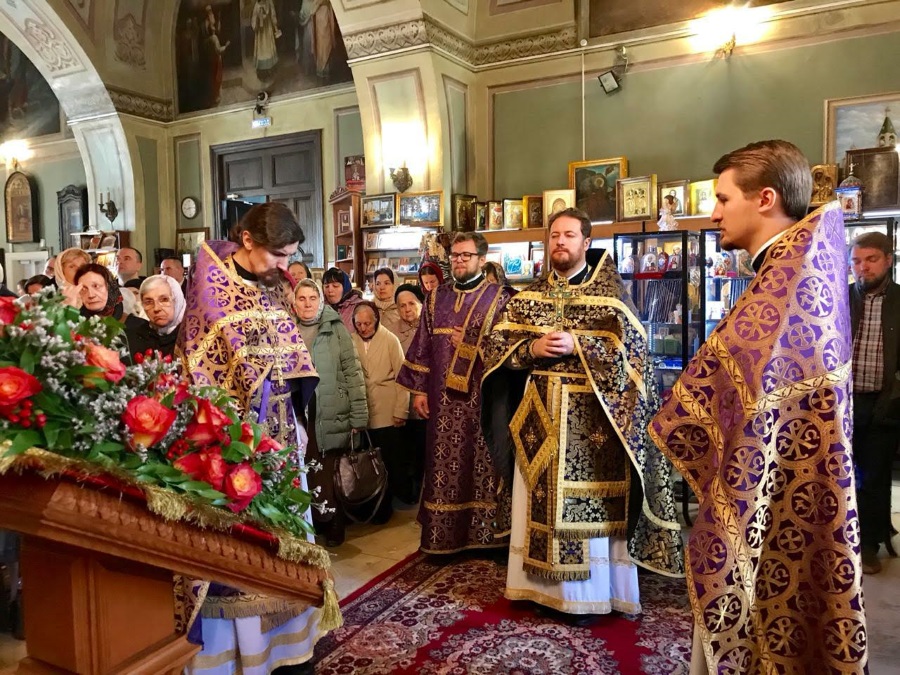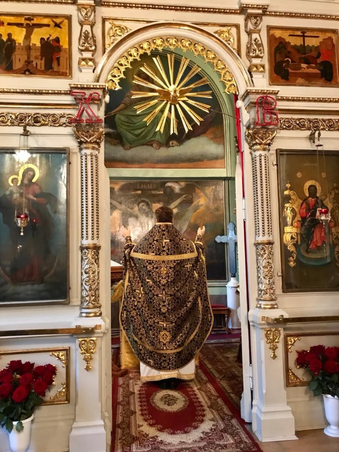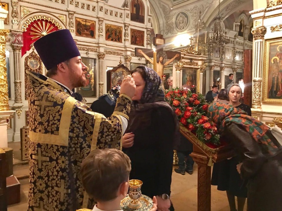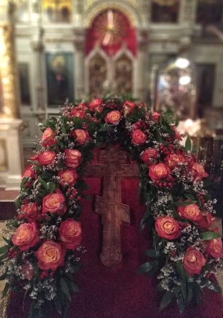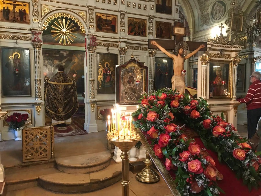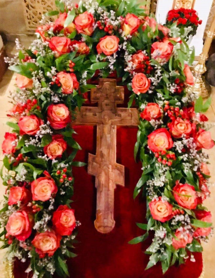 Накануне праздника вечером духовенство нашего храма соборно отслужило торжественное всенощное бдение. После великого славословия из алтаря был вынесен Крест, украшенный живыми цветами. Символ нашего спасения был возложен на аналой в центре храма, и верующие совершили ему поклонение.