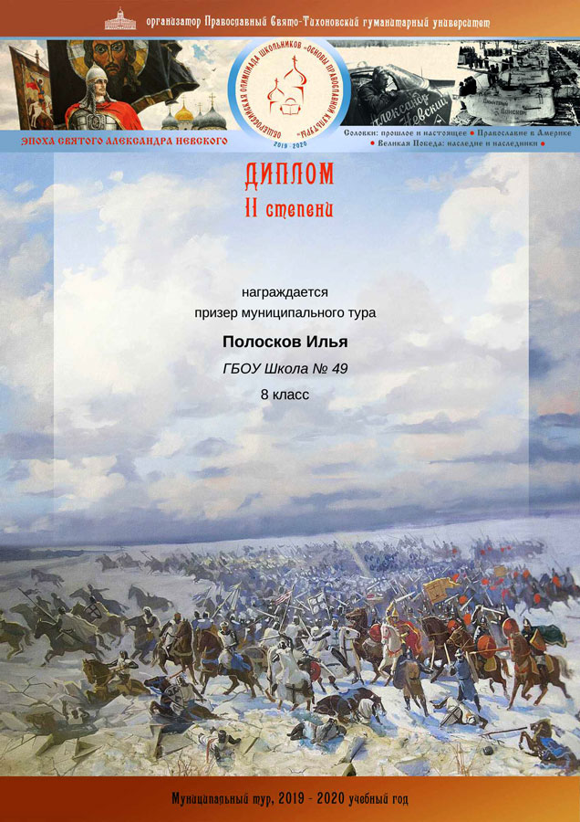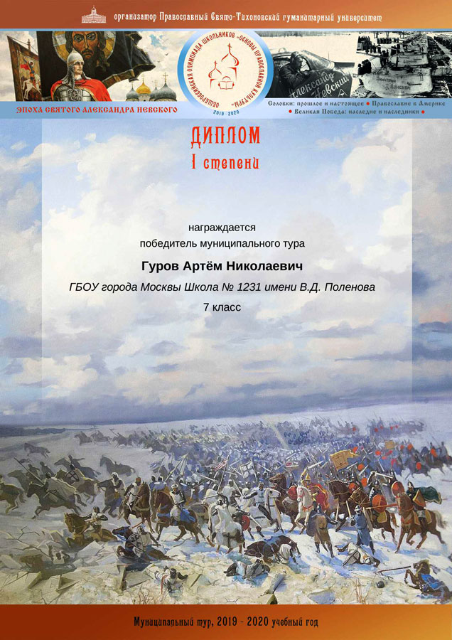 Ученики нашей воскресной школы приняли участие в муниципальном туре олимпиады «Основы православной культуры» в административных округах столицы, к которым относятся их общеобразовательные заведения (в Центральном административном округе олимпиада была организована Центральным викариатством и Городским методическим центром Департамента образования г. Москвы). Победителем муниципального тура олимпиады стал наш прихожанин — Артем Гуров, а призером — Илья Полосков.