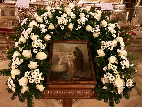 Весь праздничный день, вплоть до закрытия храма в 23 часа, не прекращался поток верующих, приходивших за великой агиасмой.