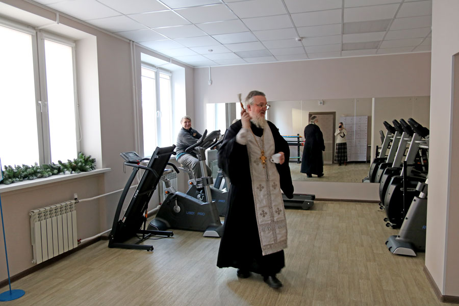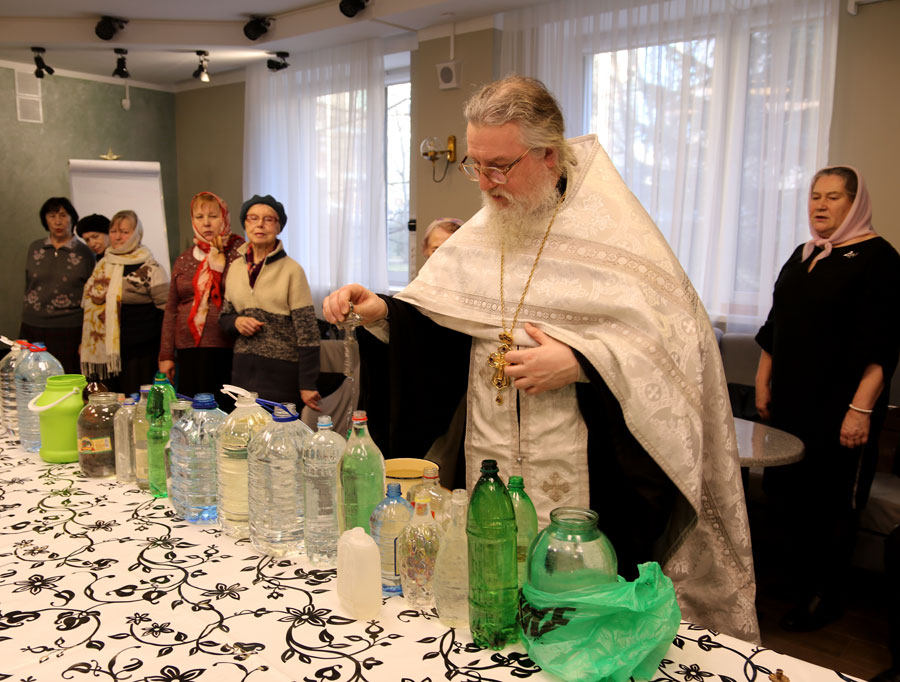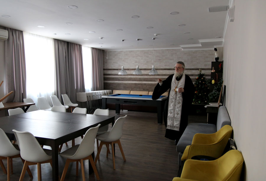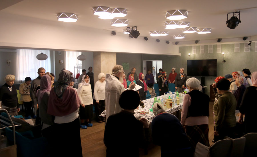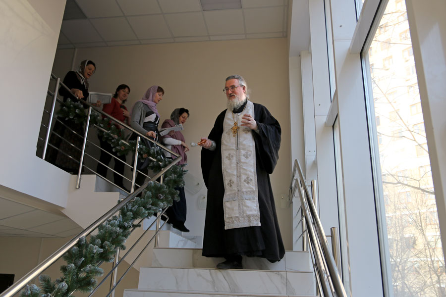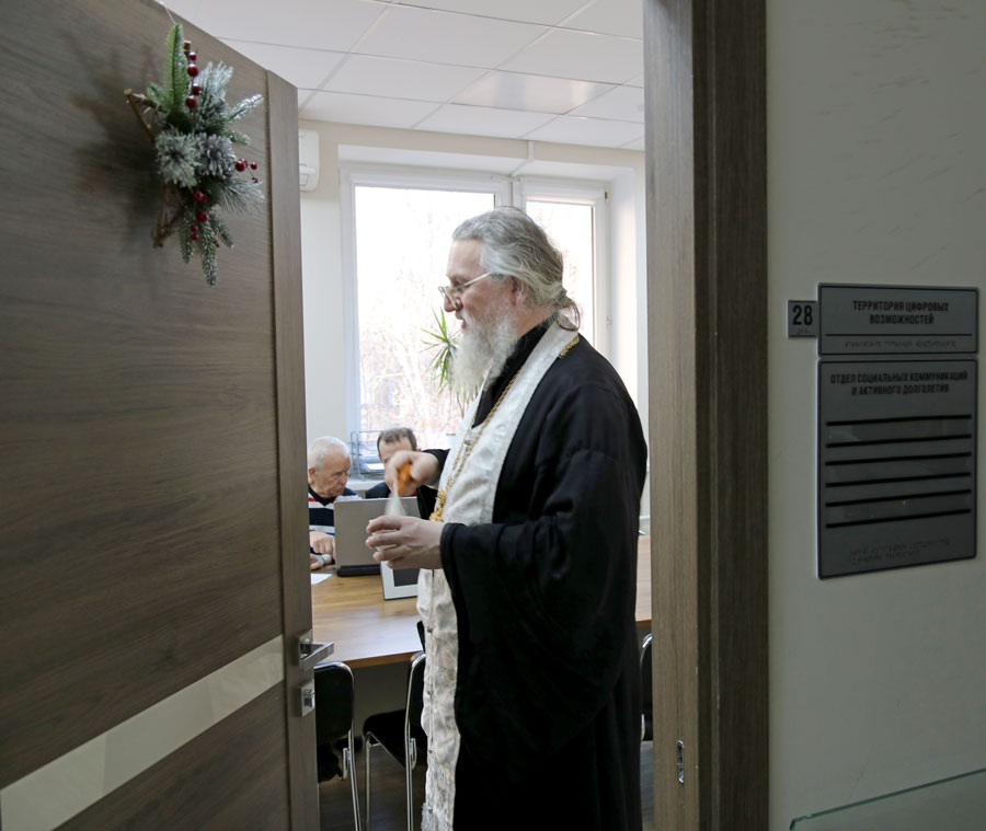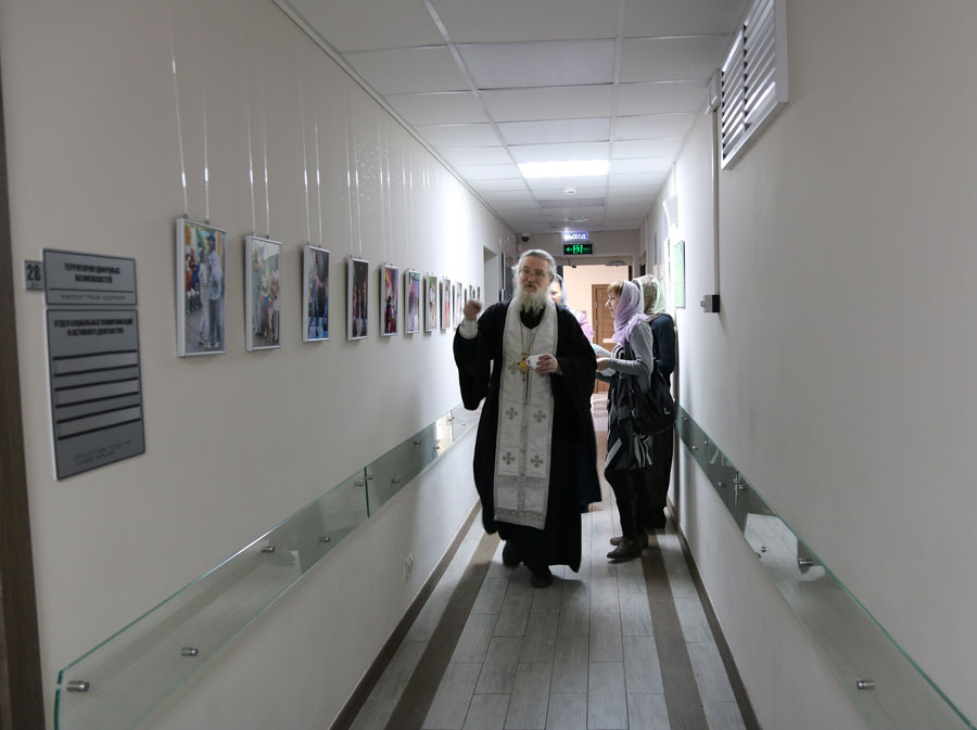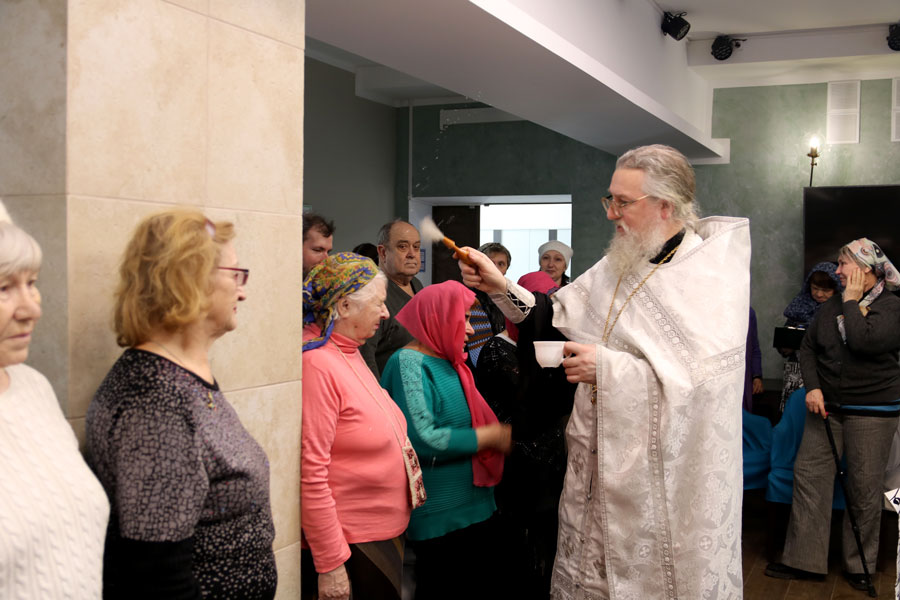Отец Николай ответил на вопросы подопечных и сотрудников ТЦСО, а также по согласованию с администрацией по традиции окропил помещения центра агиасмой.