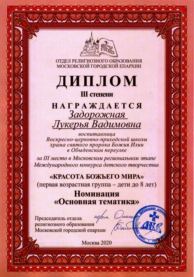Ученица нашей воскресной школы стала призером епархиального этапа Международного конкурса детского творчества «Красота Божьего мира».