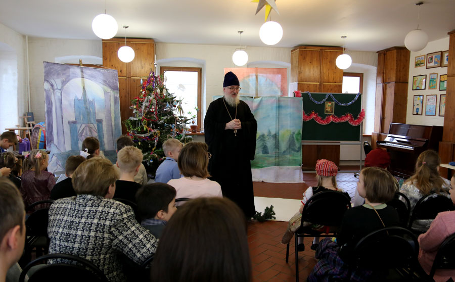 Детский праздник начался пением тропаря Богоявления. С приветственным словом к детям и родителям по благословению настоятеля Илие-Обыденского храма протоиерея Максима Шевцова обратился клирик Илие-Обыденного храма, духовник воскресной школы протоиерей Николай Скурат.