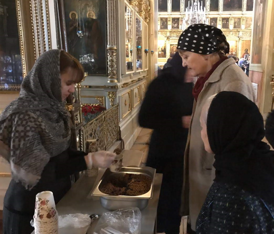 После заамвонной молитвы был отслужен молебный канон святому великомученику Феодору Тирону с чином освящения колива, которое после богослужения раздавалось прихожанам.