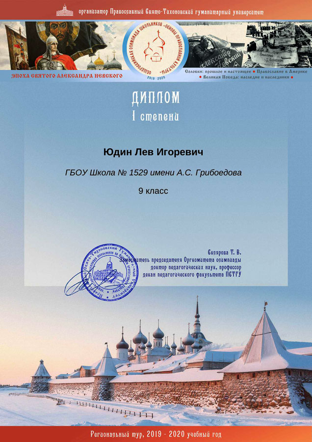 Поздравляем и благодарим Льва, его родителей и всех педагогов за их труды, администрацию гимназии № 1529 за содействие, которые были оценены организаторами олимпиады! Надеемся, что эта победа будет способствовать более глубокому осознанию родителями и учащимися необходимости участия в олимпиадах по основам православной культуры.