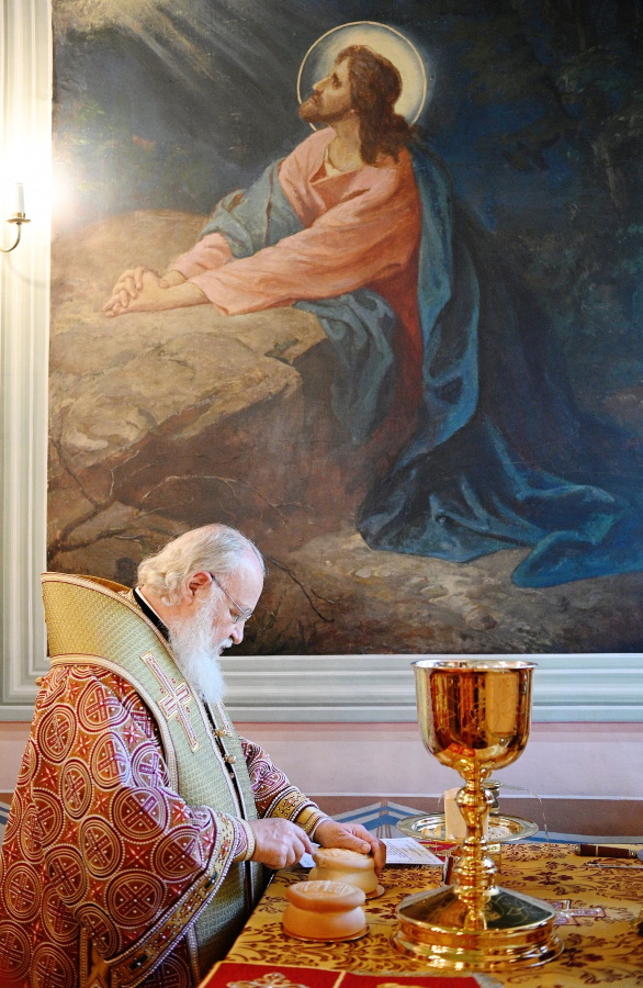 После сугубой ектении Предстоятель Русской Православной Церкви вознес молитву, во время распространения вредоносного поветрия чтомую.