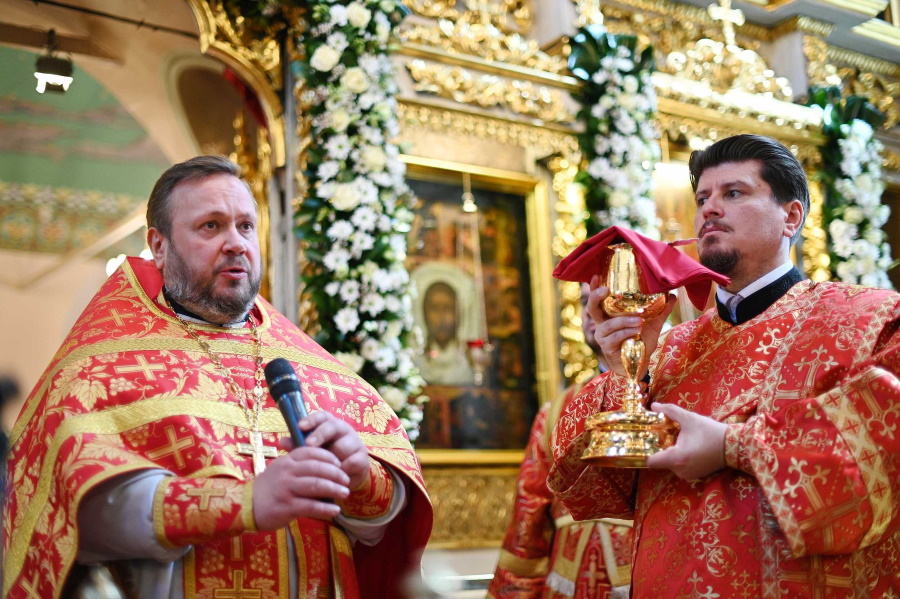 Проповедь перед причастием произнес священник Андрей Дорохин, клирик храма пророка Божия Илии в Обыденском переулке.