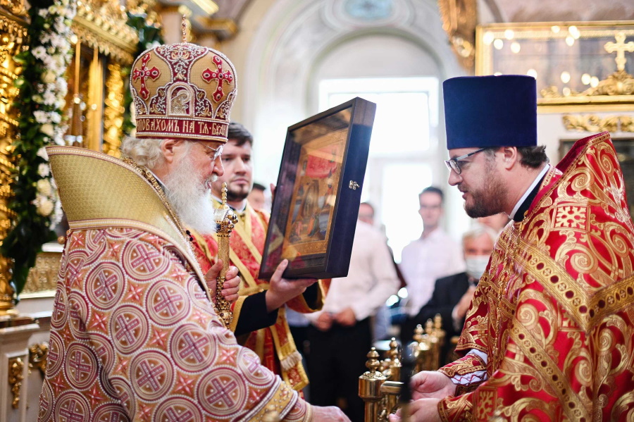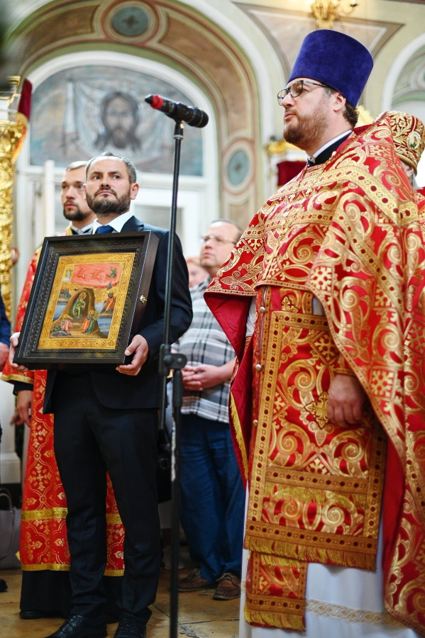 От лица духовенства, приходского совета и прихожан Святейшего Владыку приветствовал настоятель храма протоиерей Максим Шевцов, преподнесший в дар Его Святейшеству икону пророка Божия Илии.