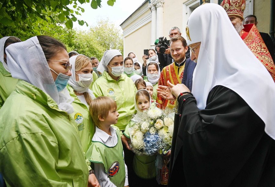 Затем на территории храма состоялось краткое общение Святейшего Патриарха Кирилла с участниками движения «Православные добровольцы». Молодые люди рассказали Его Святейшеству о проведенной в период карантина социальной акции #ПроДобро, в рамках которой они оказывали помощь пожилым людям. В мероприятии участвовали более 300 волонтеров.