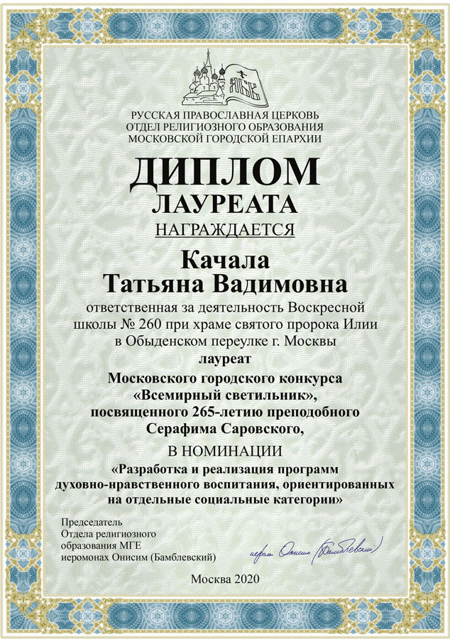 Отдел религиозного образования Московской городской епархии вручил Татьяне Вадимовне Качале, ответственной за деятельность нашей воскресной школы, диплом лауреата Московского городского конкурса «Всемирный светильник», посвященного 265-летию преподобного Серафима Саровского.