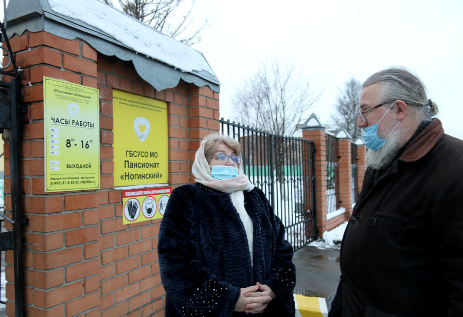 Уже более двадцати лет наш приход сотрудничает с Ногинским домом-интернатом для престарелых и инвалидов. Сейчас он называется государственным бюджетным стационарным учреждением социального обслуживания Московской области «Пансионат “Ногинский”». Ответственный за окормление дома-интерната протоиерей Николай Скурат передал для подопечных пансионата православные книги и газеты, а также иконки. Коробки с книгами в Ногинск доставила ответственная за воскресную школу Т. В. Качала. Батюшка также встретился с психологом пансионата и ответственной за домовый храм благоверного князя Александра Невского Г. В. Соловьевой.