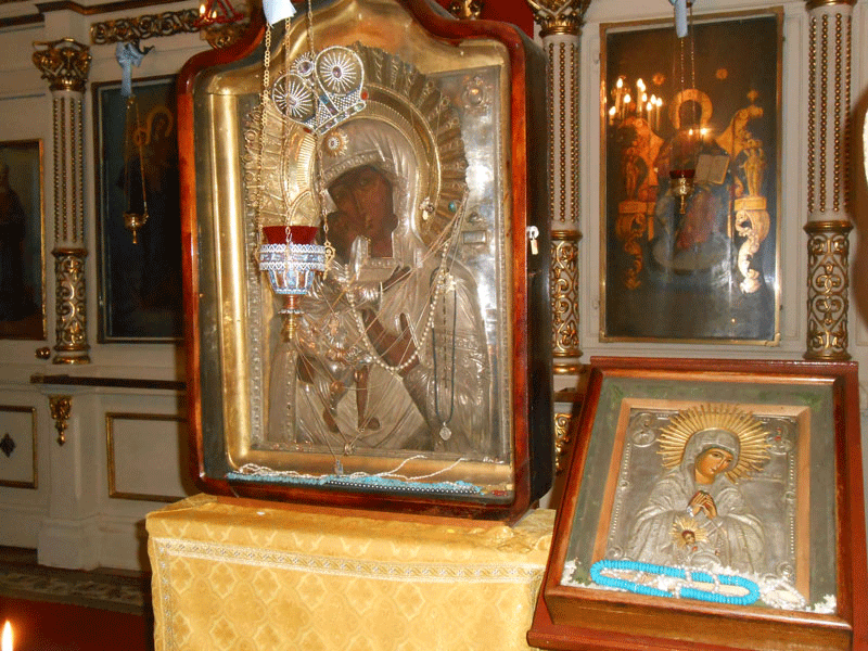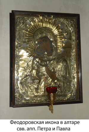 В нашем храме находятся два образа Богородицы «Феодоровская». Один из них хранится в алтаре, в приделе святых апостолов Петра и Павла. Другой, написанный во второй половине XVIII века и считающийся очень точным списком чудотворной костромской иконы, расположен в приделе святых Симеона Богоприимца и Анны пророчицы. Его украшает серебряный оклад и приношения благодарных молитвенниц — ведь Феодоровская икона Божией Матери почитается православным народом как покровительствующая семейному благополучию, помогающая в зачатии, в трудных родах, а затем и в воспитании детей, дарованных Богом по Ее милостивому предстательству.