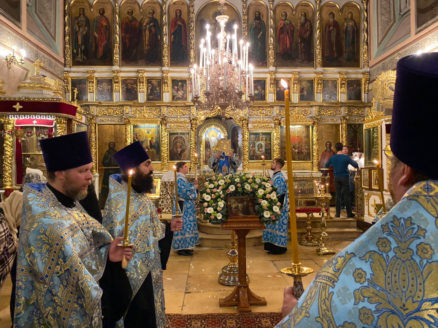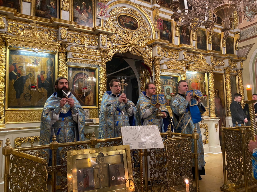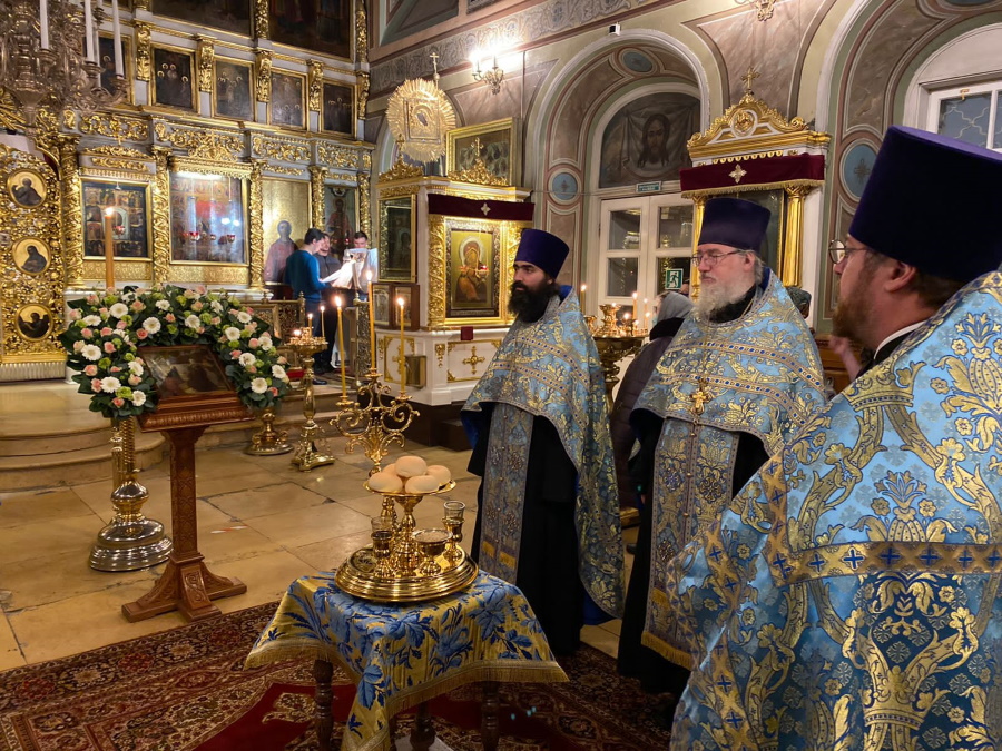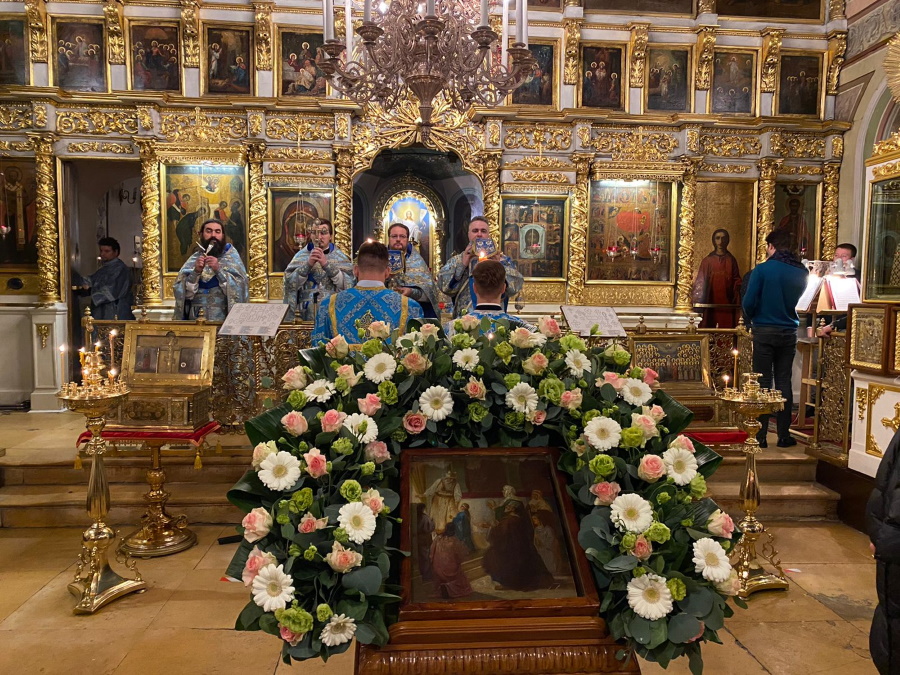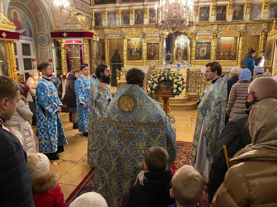 Вечером накануне праздника духовенство храма соборно отслужило торжественное всенощное бдение. Праздничное богослужение, на котором верующие величали Честнейшую Херувим и Ее вхождение в Иерусалимский храм, явилось также предвозвещением близкого Рождества Христова — в этот день впервые прозвучали радостные ирмосы «Христос раждается, славите!».