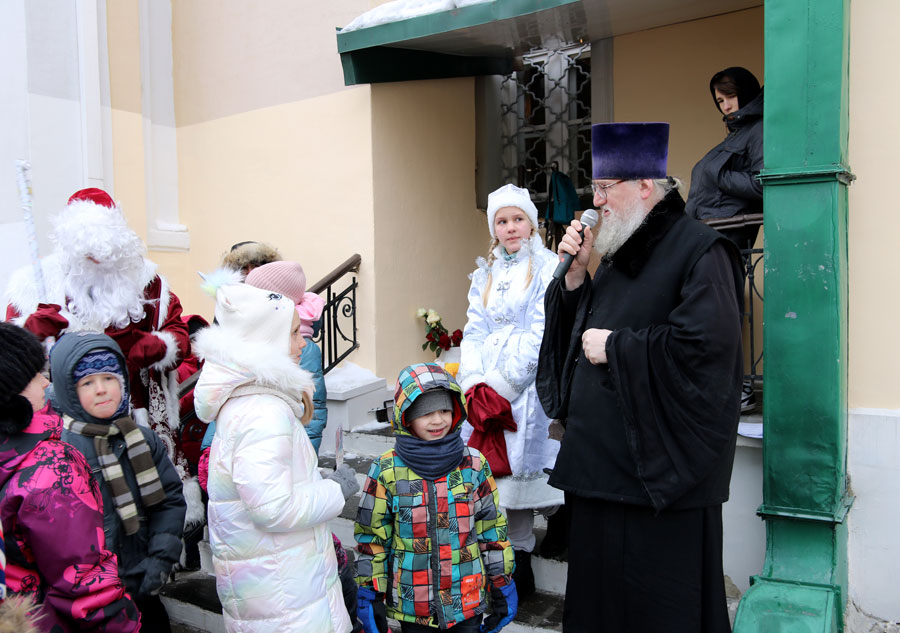 Собравшиеся пропели тропарь праздника Рождества Христова. Затем с приветственным словом к детям и родителям обратился духовник воскресной школы протоиерей Николай Скурат, который поздравил всех с Рождеством Христовым, передал приветствие и благословение отца настоятеля.