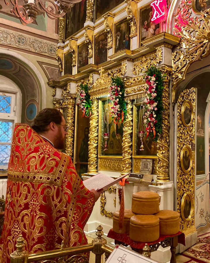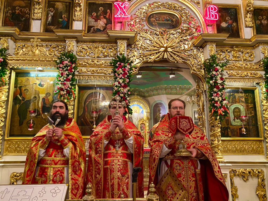 В конце богослужения был освящен артос, который всю предстоящую седмицу будет стоять в открытых Царских вратах — в Светлую Субботу его раздробят и раздадут верующим.