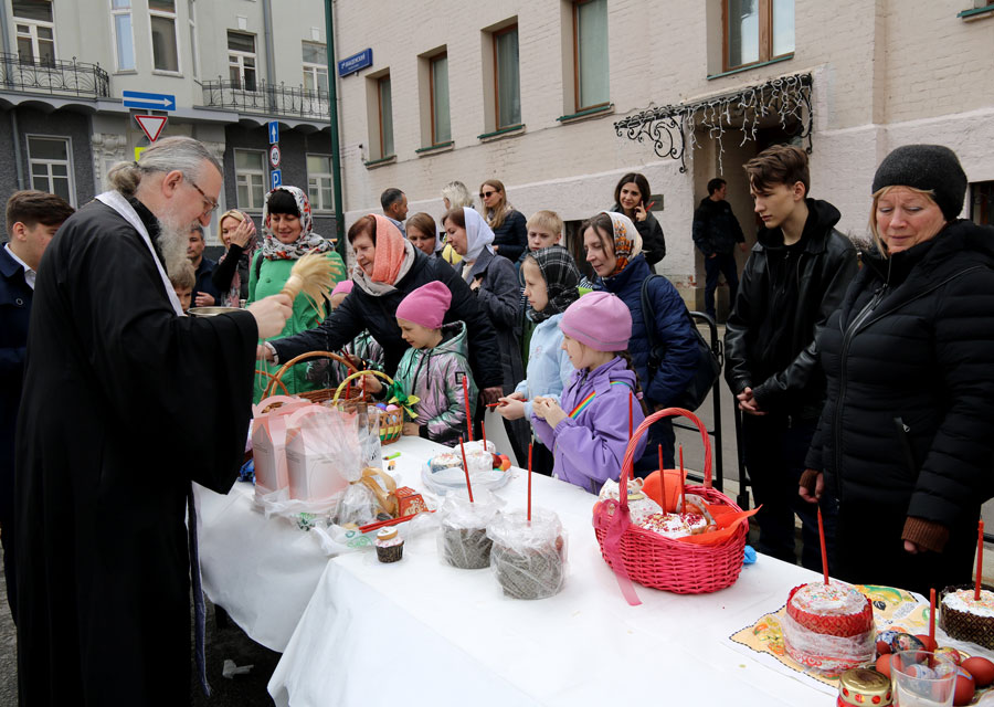 Отец Николай освятил пасхальные снеди, которые принесли ребята и их родители.