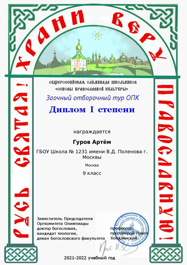 Учащийся старшей группы детской воскресной школы Артем Гуров получил диплом победителя Отборочного (индивидуального) тура для учащихся 8–11 классов. Подготовкой учеников нашей воскресной школы к олимпиаде занималась преподаватель Т. В. Качала.