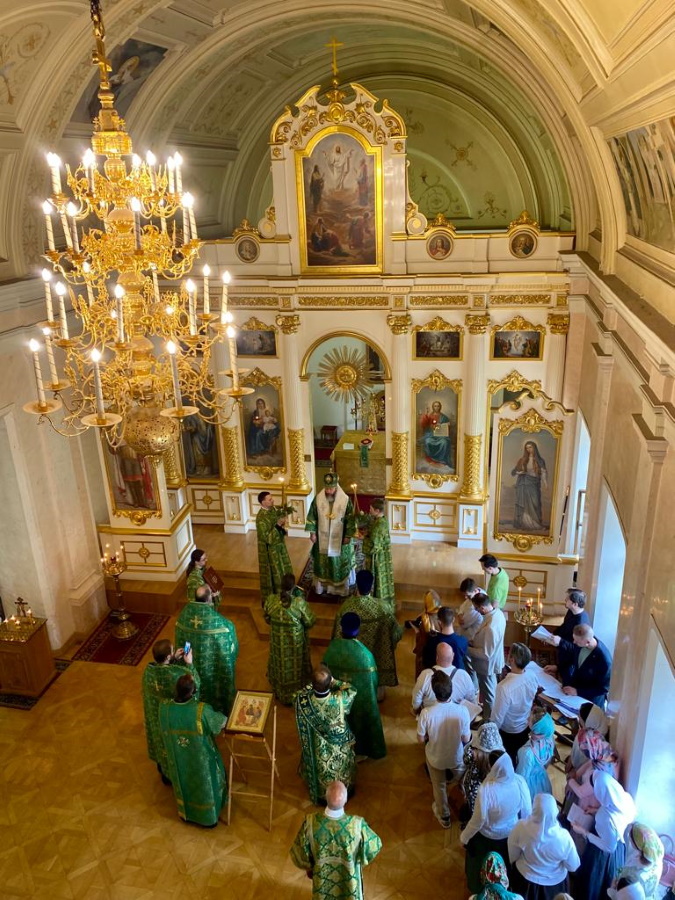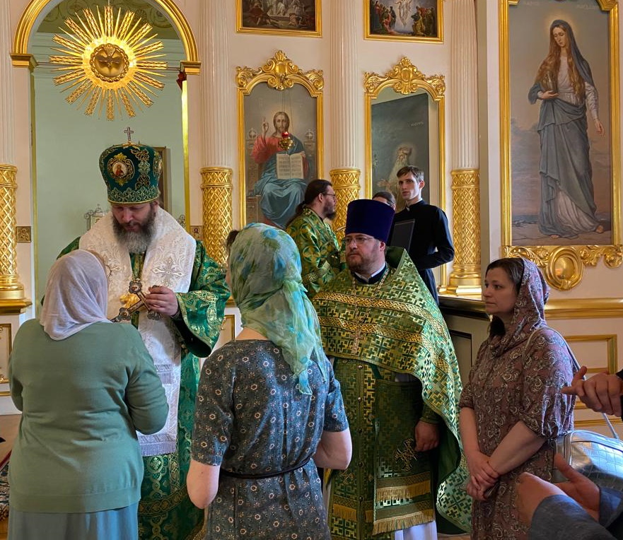 В понедельник, в День Святого Духа, по благословению Святейшего Патриарха Московского и всея Руси Кирилла праздничное богослужение в храе равноапостольной Марии Магдалине возглавил викарий Святейшего Патриарха, сопредседатель епархиальной Комиссии по работе с вузами и научным сообществом, наместник Высоко-Петровского монастыря епископ Луховицкий Евфимий. Его Преосвященству сослужили настоятель храма пророка Божия Илии в Обыденском переулке протоиерей Максим Шевцов, иерей Димитрий Дейкин, клирики Высоко-Петровского монастыря иеромонах Константин (Симон) и иеромонах Матфей (Мунтяну), а также диаконы Иоанн Извеков и Александр Багрин.
