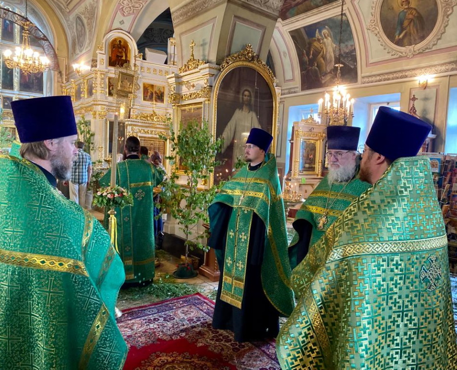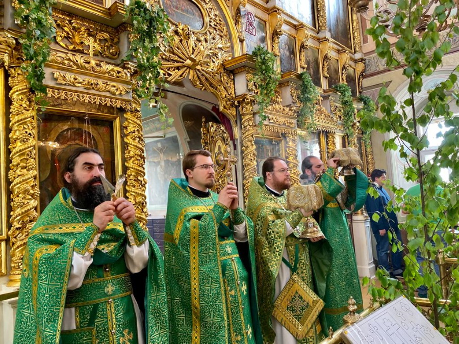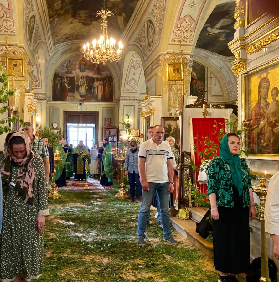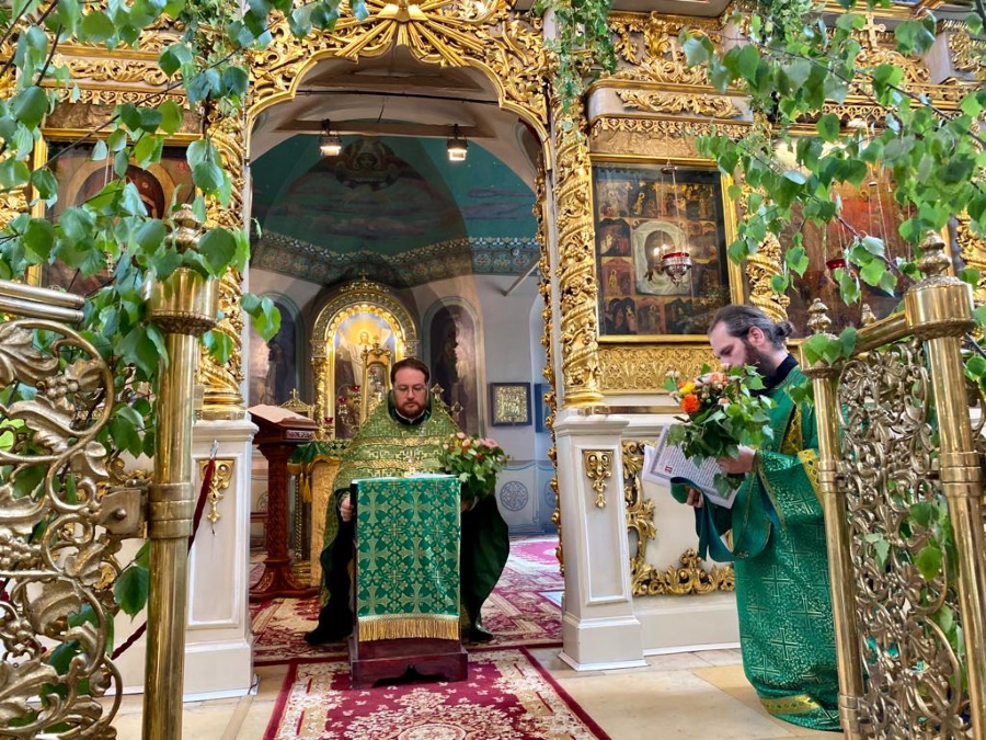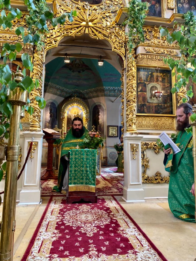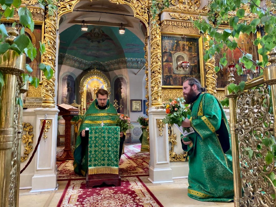 Возглавил богослужение настоятель храма протоиерей Максим Шевцов. Свежесть и аромат березовых ветвей, цветов и травы, покрывшей храмовый пол, напомнили о явлении Троицы праотцу Аврааму у дуба Мамврийского, о Сионской горнице, в честь иудейской Пятидесятницы украшенной зеленью, и о таинственном обновлении душ благодатью Святого Духа.