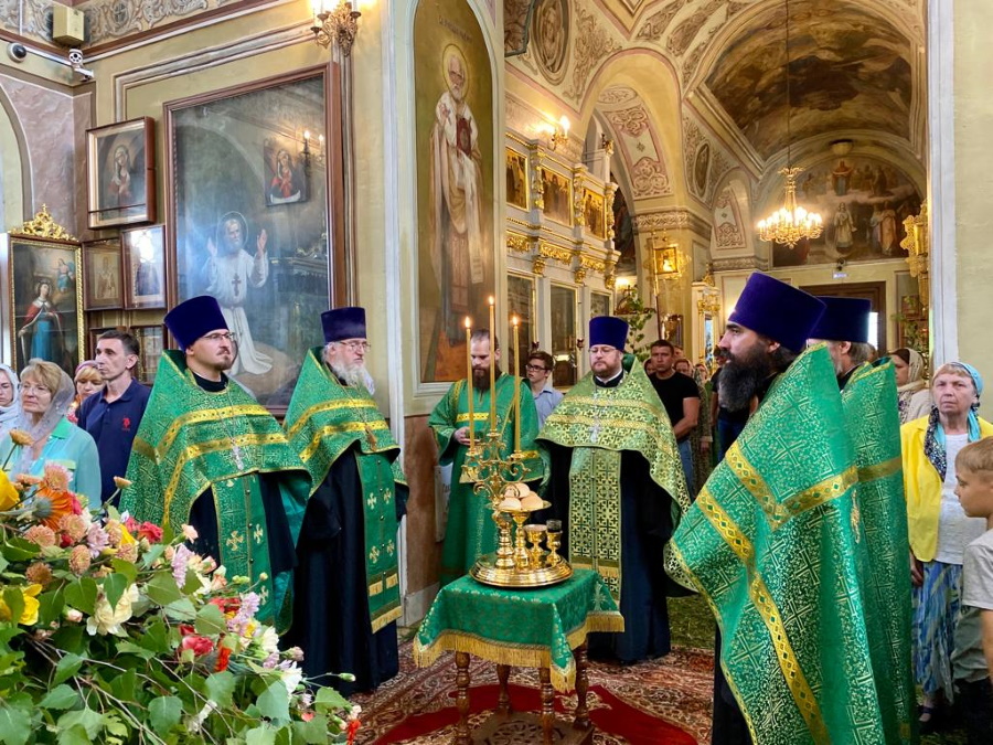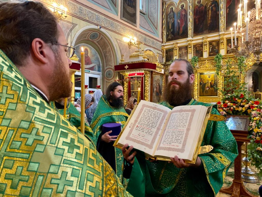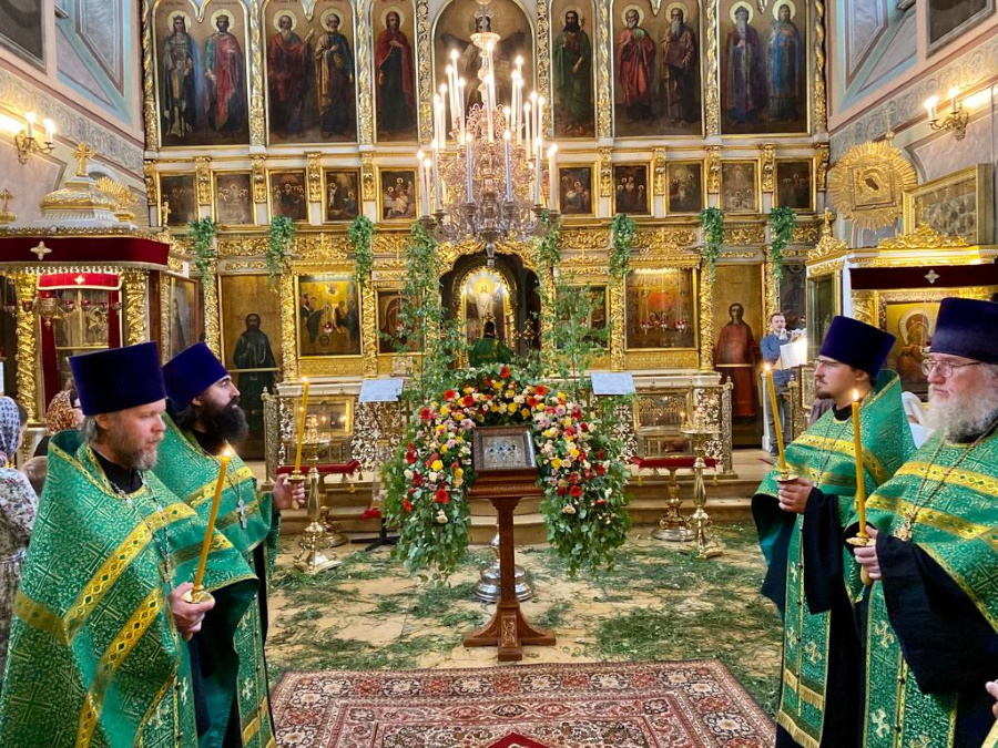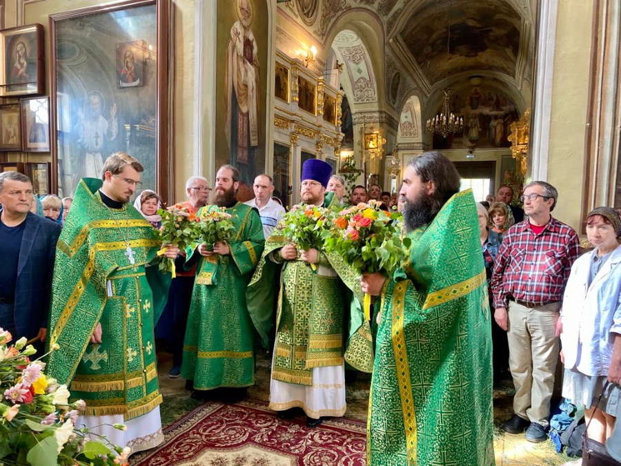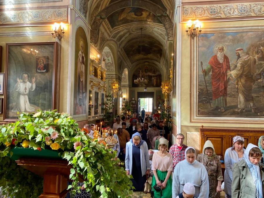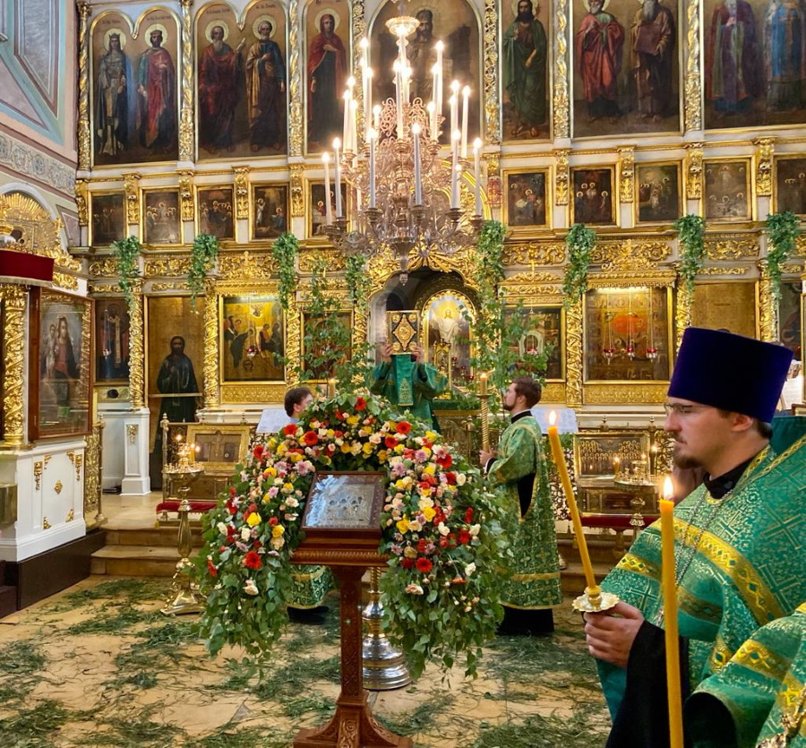 Возглавил богослужение настоятель храма протоиерей Максим Шевцов. Свежесть и аромат березовых ветвей, цветов и травы, покрывшей храмовый пол, напомнили о явлении Троицы праотцу Аврааму у дуба Мамврийского, о Сионской горнице, в честь иудейской Пятидесятницы украшенной зеленью, и о таинственном обновлении душ благодатью Святого Духа.