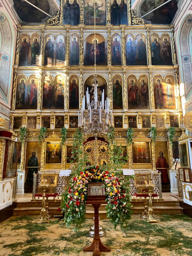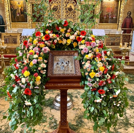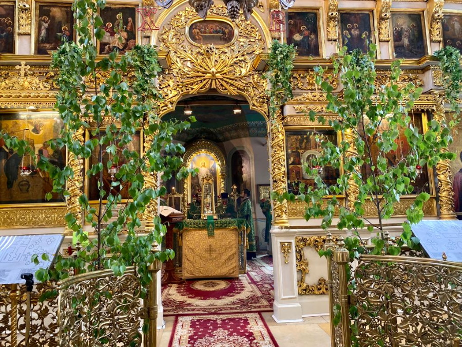Накануне праздника, в субботу вечером, было совершено торжественное всенощное бдение, к началу которого храм усилиями его работников преобразился, облачившись в традиционное для Троицы зеленое убранство.