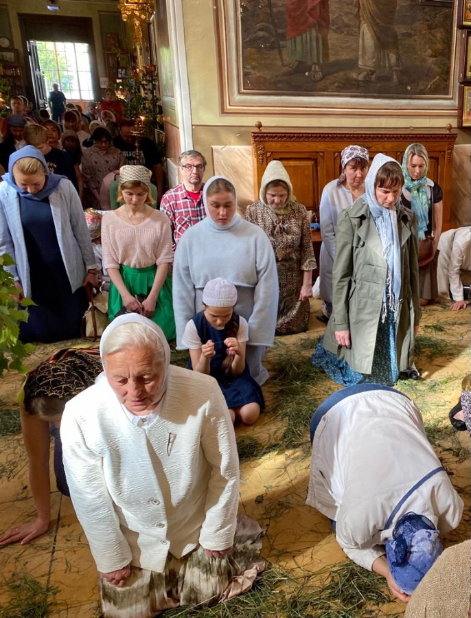 Общим пением «Царю Небесный» началась великая вечерня праздника Пятидесятницы с чтением трех коленопреклонных молитв. После великой ектении с особыми прошениями о предстоящих и ожидающих Духа Святого людях и великого прокимена «Кто бог велий, яко Бог наш» верующие впервые после Пасхи опустились на колени, испрашивая у Пресвятой Троицы благодатной небесной помощи для живущих и упокоения для усопших.