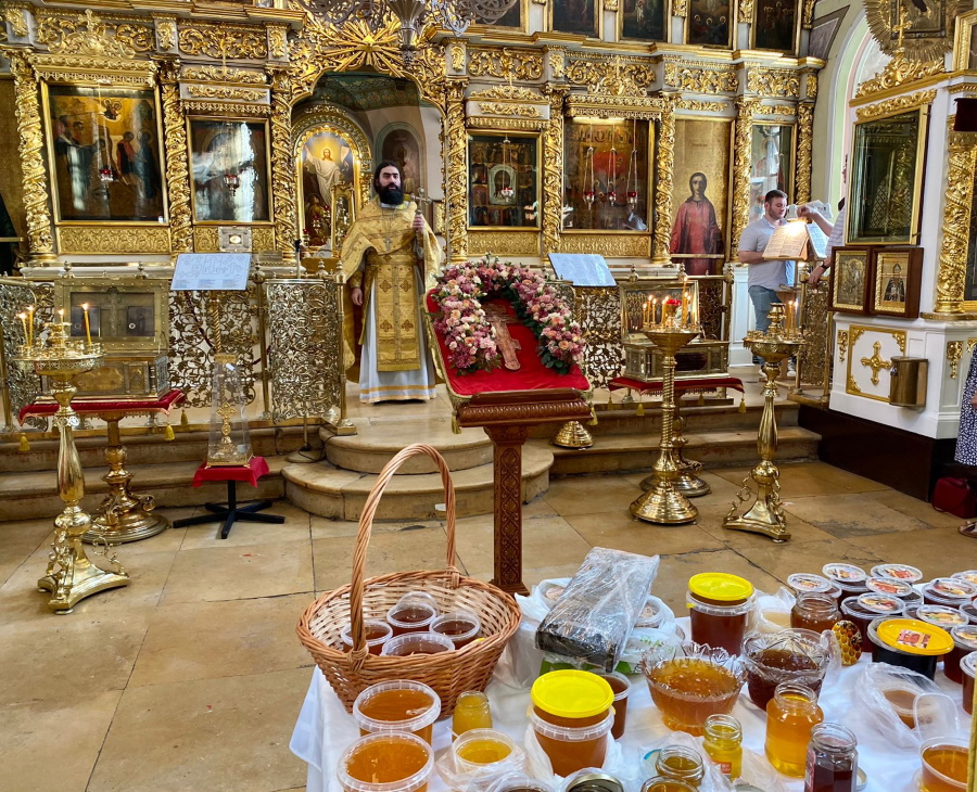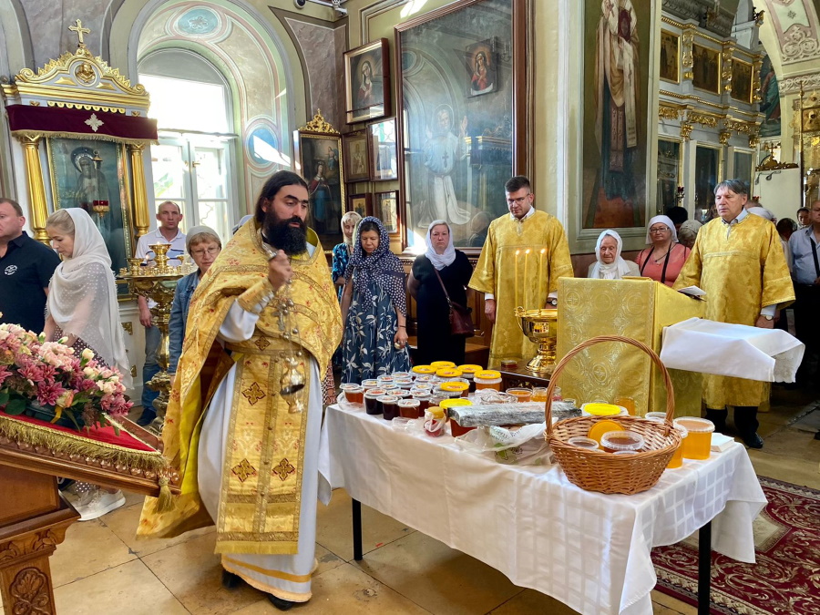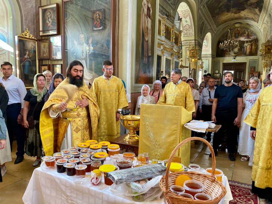 Первый, совпадающий с началом поста и с изнесением Креста Господня, в церковном календаре обозначен как празднество Всемилостивому Спасу и Пресвятой Богородице. Оно установлено по случаю знамений от икон Спасителя, Божией Матери и честного Креста во время сражения святого благоверного князя Андрея Боголюбского с волжскими булгарами в 1164 году. В народе этот день называется Медовым Спасом, потому что 1 (14) августа после литургии совершается водосвятный молебен и освящение меда нового сбора.