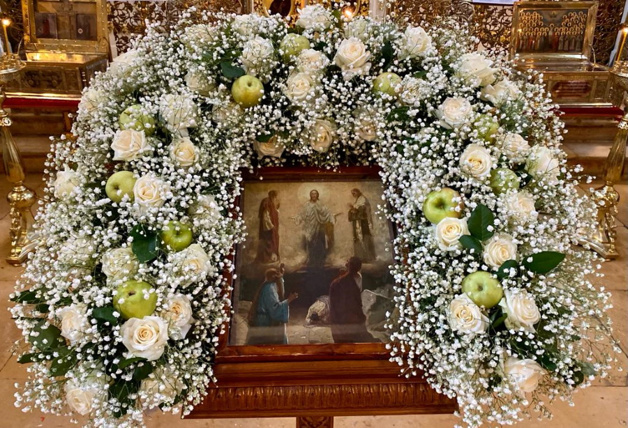 Запах ладана смешивался со свежим ароматом принесенных прихожанами яблок, винограда и других фруктов. После литургий совершался чин освящения плодов, давший празднику Преображения второе, народное, название Яблочный Спас.