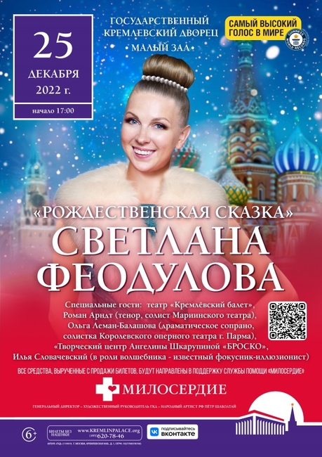 25 декабря 2022 года состоится благотворительный концерт оперной певицы Светланы Феодуловой в Малом зале Государственного Кремлевского дворца г. Москвы (г. Москва, ул. Воздвиженка, д. 1), средства от которого будут направлены в помощь проектов Православной службы помощи «Милосердие», таких как детская и взрослая паллиативные выездные службы, служба помощи бездомным, единственный в России негосударственный дом для детей-инвалидов, поддержка женщин в тяжелой жизненной ситуации, а также на проекты поддержки «особого» детства и многое другое.
