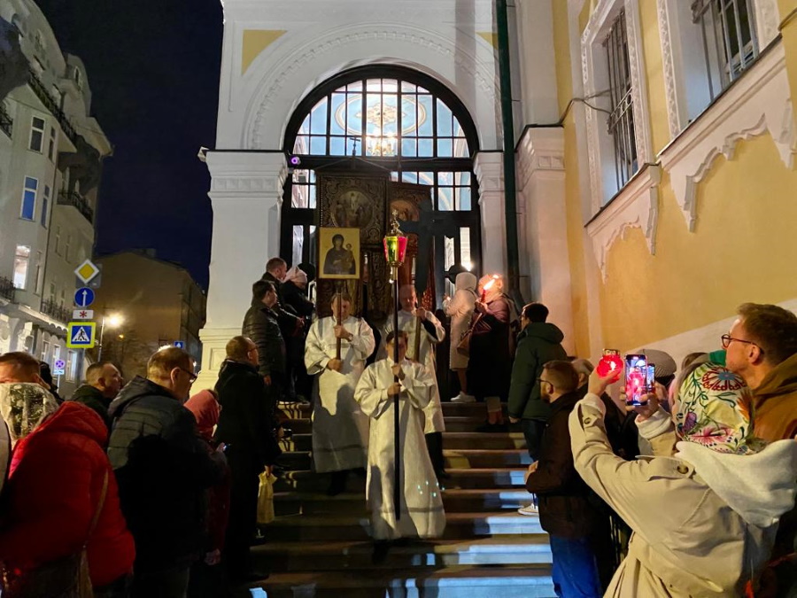 После полунощницы Святая Плащаница, перед которой вечером читались Деяния святых апостолов, была унесена священством в алтарь. Через несколько минут из-за закрытых Царских врат послышалось сначала негромкое, а затем все набирающее силу пение тропаря «Воскресение Твое, Христе Спасе». Мощно и жизнеутверждающе звучал он во время многолюдного крестного хода, совершенного с хоругвями, иконами и красными свечами и фонариками вокруг храма.