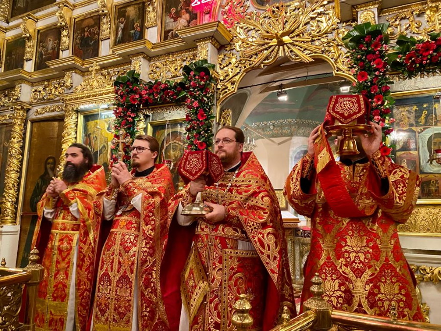 В конце богослужения был освящен артос, который всю предстоящую седмицу будет стоять в открытых Царских вратах — в Светлую Субботу его раздробят и раздадут верующим.