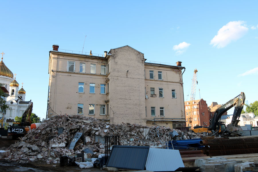 Главной целью посещения было ознакомление с проектом фирмы Sminex-Интеко по застройке участка земли, соседствующего с территорией нашего храма с юга. На этой земле в последнее время находились здание электроподстанции для строительства Дворца Советов, построенное в 1930-е годы, и два двухэтажных заводских корпуса, ныне снесенные, а также флигель дома Ковригиных, единственно уцелевший из всего Ковригинского комплекса построек, разрушенных фугасной бомбой немецко-фашистскими налетчиками в 1941 г.
