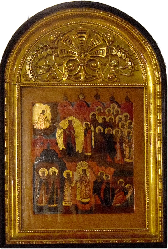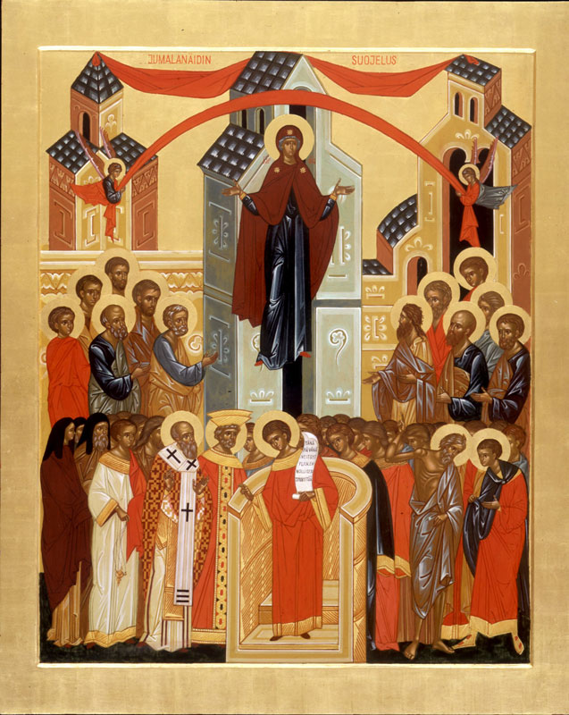 «Святая Православная Церковь вспоминает ныне благодеяние, чудесно оказанное Божией Материю христианам в 910 году в Константинополе при греческом императоре Льве Премудром. Сарацины с большими силами напали на город и грозили ему совершенным разрушением. Не видя ниоткуда помощи, греки во множестве стеклись во Влахернский храм, в котором хранилась риза Богоматери, и молились, как вдруг св. Андрей Христа ради юродивый, бывший тут со своим учеником Епифанием, увидел под самыми сводами величественного храма Богоматерь со множеством Ангелов и святых, стоящую в воздухе, сияющую, как солнце, с омофором в руках, молящуюся о всем мире и о спасении града и жителей в нем. На следующий день неприятель был рассеян без всякого кровопролития и греки одержали победу по заступлению Божией Матери.