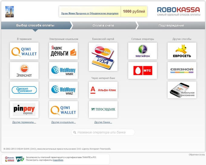 Оказать финансовую поддержку храму и перевести на его счет посильную денежную сумму можно теперь прямо с компьютера. Новый сервис «Онлайн-пожертвования» использует современные защищенные электронные платежные системы, и какой бы из способов перевода денег вы ни выбрали – с банковской карточки, из электронного кошелька, со счета у мобильного оператора или через терминалы, он не займет много времени и не потребует личного приезда в храм для этой цели.