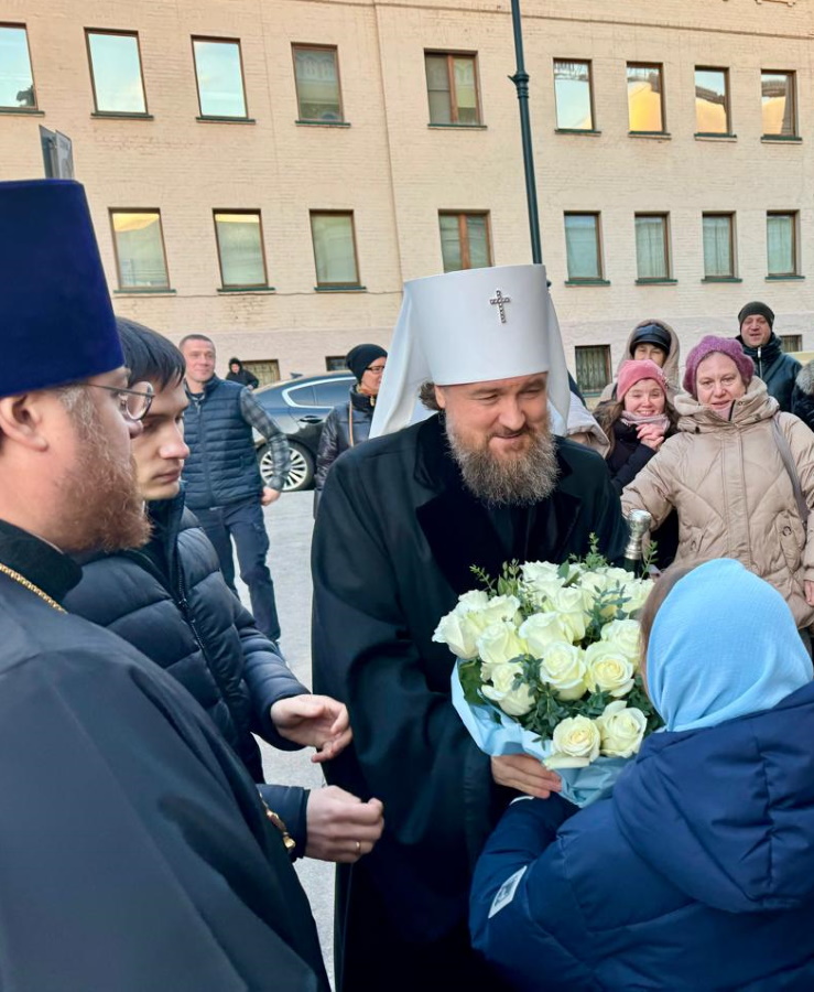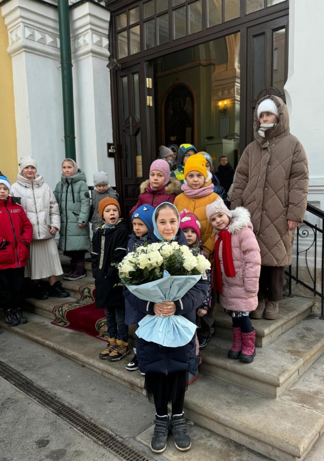 У храма владыку встречала группа младших представителей Обыденского прихода — большим букетом цветов и трогательным приветственным возгласом.