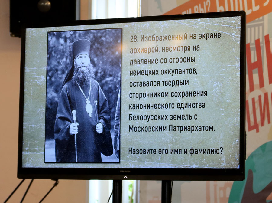 Вопросы игры касались жизни и деятельности Русской Православной Церкви и ее отдельных представителей в годы Великой Отечественной войны. Команды должны были знать: имя, фамилию и должность протоиерея, который к началу Великой Отечественной войны занимал один из ключевых постов церковного управления Московской Патриархией; какое событие произошло в годы Великой Отечественной войны в деревне Горелки Тульской области; название кафедрального Ленинградского собора в 1941–1999 гг.; какое обвинение было вменено осужденным митрополиту Феофану (Тулякову), архиепископу Серафиму (Остроумову) и епископу Иннокентию (Никифорову); о восстановление евхаристического общения с какой Поместной Православной Церковью велись переговоры в 1943 г.; имя церковного иерарха, который написал стихотворение, посвященной И.В. Сталину; какой образ носил с собой маршал Б.М. Шапошников и многое другое.