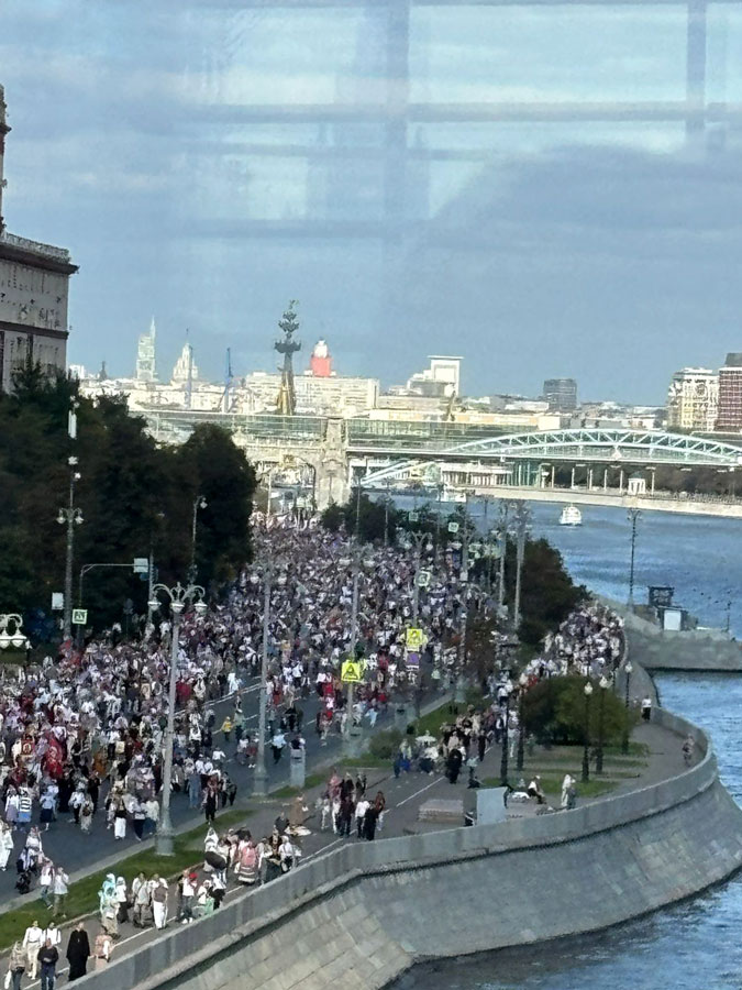 Задолго до начала крестного хода огромная очередь участников выстроилась от станции «Библиотека им. Ленина» до ул. Ленивки, где был официальный вход на крестный ход для тех, кто не смог попасть на богослужение в Храме Христа Спасения. От Ленивки до Соймоновского проезда собравшиеся православные христиане ожидали Святейшего Владыку и начало крестного хода.